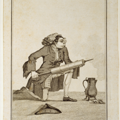 Mounted black and white etching, entitled ‘Apotekeren / l’Apothicaire’, designed by Jacques Antoine Arlaud, etched by ‘S’ and published by ‘C’, around 1730. This caricature depicts ...
