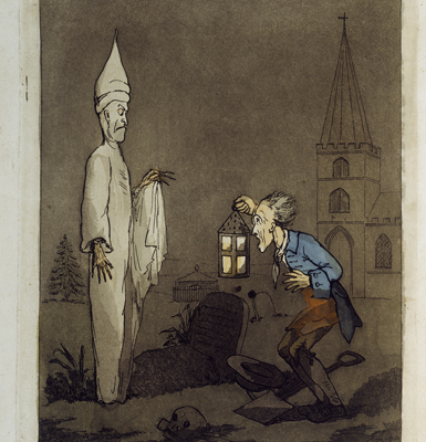 Mounted hand coloured etching and aquatint, entitled ‘AN APPARITION.’, designed and etched by Richard Newton, and published by William Holland in 1790. ASt in a churchyard ...