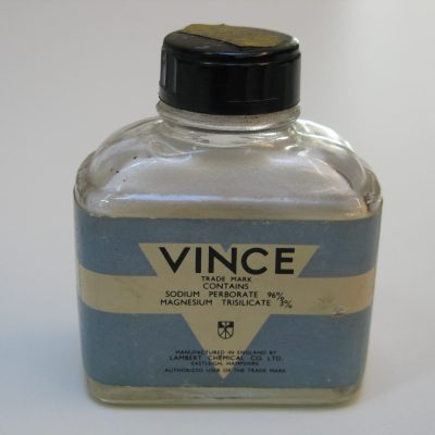 Glass bottle containing Vince Power. Manufactured by Lambert Chemical Company Limited, Eastleigh. The powder was used as a mouthwash, gargle, tooth powder, or for cleaning ...