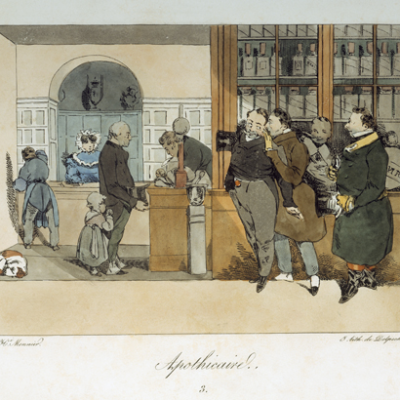 Mounted coloured lithograph, entitled ‘Apothicaire’, designed by Henri Monnier, lithographed by Francois-Seraphin Delpech, and published by anon in 1824. Plate 3; interior of a drugstore. ‘Apothicaire’ provides ...
