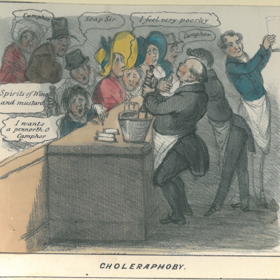 Mounted coloured lithograph, entitled ‘CHOLERAPHOBY.’, drawn by Robert “Shortshanks” Seymour, lithographed by anon, and published by Thomas McClean in 1831. Distraught customers crowd around an apothecary’...