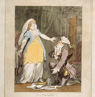‘Doctor Gallipot Placing his Fortune at the Feet of his Mistress, Thro’ Physic to the Dogs’ 1808