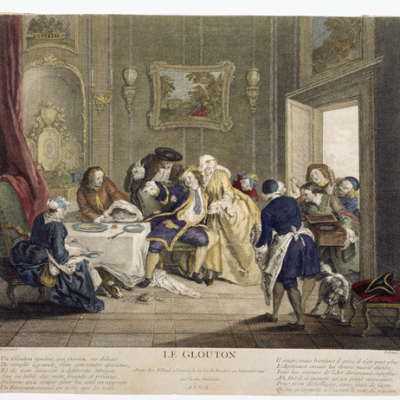 Mounted hand coloured etching and engraving, entitled ‘LE GLOUTON’, designed by Paterre, etched and published by Filloeul in 1736. A glutton is being reluctantly dragged from ...