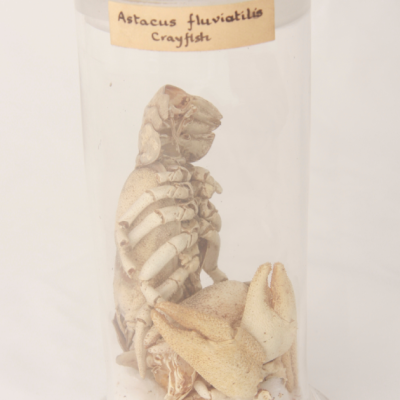 Glass specie jar containing a specimen of Astacus fluviatilis (Astacus astacus), the crayfish. From the Burges Collection. Text on paper contents label reads ‘Astacus fluviatilis ...