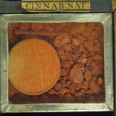 Tin from drawer no. 10 in Corbyn Cabinet containing a specimen of mercuric sulphide (cinnabar). The tin has a painted label reading ‘Metal: &c’. Tin. Label ...