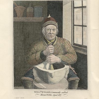 Coloured engraving “WILLM. WILSON. Commonly called Mortar Willie. Aged 107” Drawn, engraved and published by John Kay in 1815. William Wilson (1709-1815), also known as ‘Mortar Willie’, ...