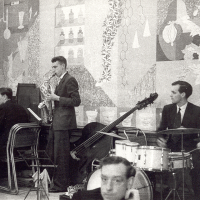Black and white photograph of a group of students at the School of Pharmacy, 17 Bloomsbury Square, London. View of 3 musicians at a student dance playing ...