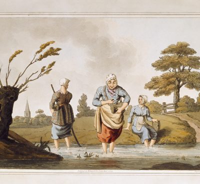 Leeches, a type of parasitic worm that feeds on blood, were used in medical bloodletting. ‘Leech Finders’ depicts three women, wearing white bonnets, wading in ...