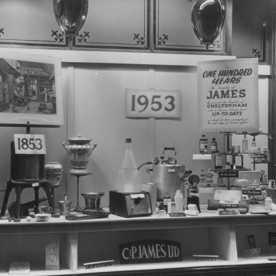 Photograph of the exterior of C. and P. James Ltd, 29 The Promenade, Cheltenham, Gloucestershire, England. The photograph shows a pharmacy window display contrasting pharmaceutical items ...