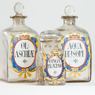 These Bohemian glass shop rounds with painted labels were possibly made in Germany or Bohemia (today much of the Czech Republic) in the 1700s. Their ...