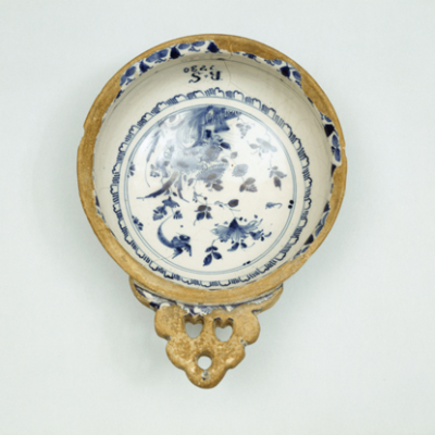 Ceramic, tin-glazed earthenware, bowl with one flat 5-lobed handle. White glaze with design in blue. Decorated with flowers and bird. Inscription ‘B.S.1730’ Porringers were ...