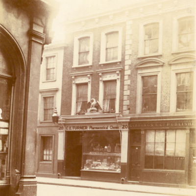 Black and white photograph of the interior of Wallis Pharmaceutical Chemist Patent Medicine and Drug Stores, 78 Essex Road, Islington, London. This photograph shows the cases and bottles opposite the counter.