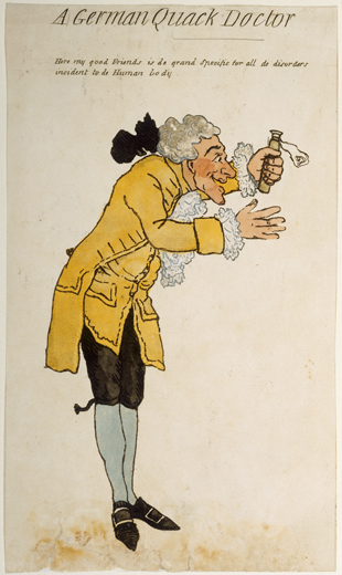 Mounted hand coloured etching and aquatint, entitled ‘A German Quack Doctor’, designed, etched and published by anon. Undated.