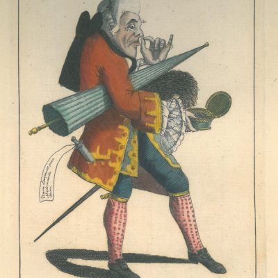 This caricature, depicts a gleeful foppish doctor, wearing a frock coat and a bag-wig. Shown in profile facing right, he leans forward ingratiatingly indicating a labelled bottle of medicine in his left hand.