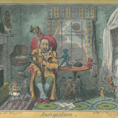 Mounted hand coloured etching and aquatint, entitled ‘AGUE & FEVER.’, designed by James Dunthorne, etched and published by Thomas Rowlandson in 1788.