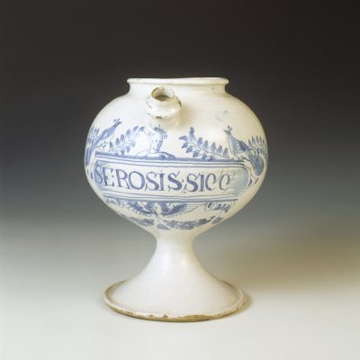 These Bohemian glass shop rounds with painted labels were possibly made in Germany or Bohemia (today much of the Czech Republic) in the 1700s. Their contents labels reveal they stored the following medicinal preparations: • ‘OL: ASCHIAE’ – Oleum Aschiae or Oil of Grayling (a fish of the salmon family, Salmo thymallus). Used for the treatment of scaly skin. • ‘AQUA HYSOPI’ – Hyssop Water. Used as an expectorant (to promote the secretion of bronchial mucus) and used to treat coughs and chest complaints. • ‘CONCHAE PRAEPAR:’ – Conchae Praeparatae or Prepared Shell