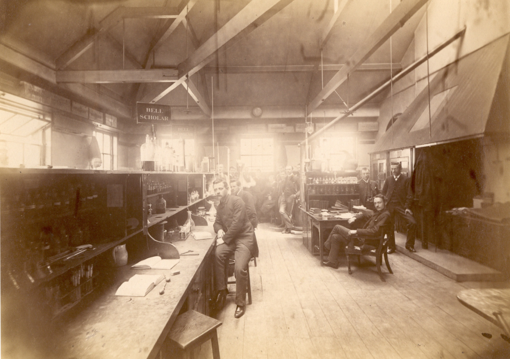 Students are posed working at their desks, including Bell Scholars Fraser McDiarmid and R.Wynn Charles Pierce, and the senior demonstrator.