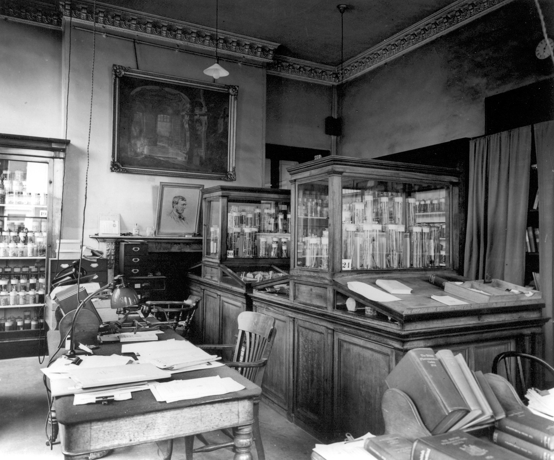 Black and white photograph of the Pharmaceutical Society of Great Britain 17 Bloomsbury Square, London. Interior of the Chemistry Museum showing materia medica and desks.
