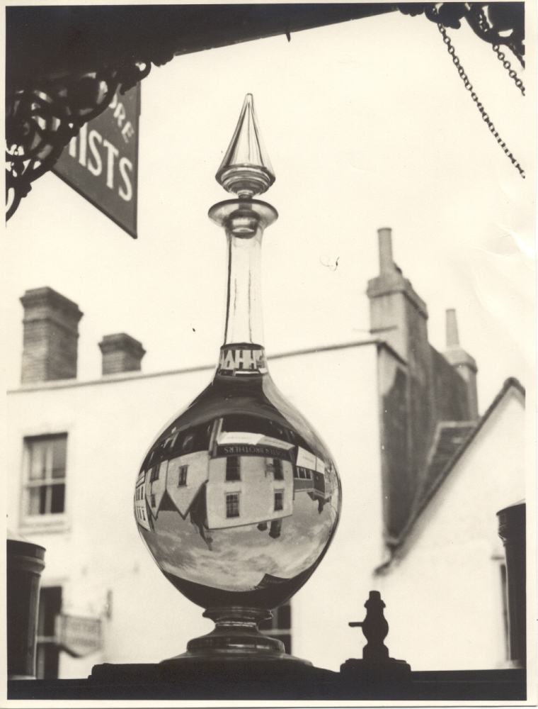 The photograph depicts a glass carboy in the window of Savory and Moore Ltd in Dorking.