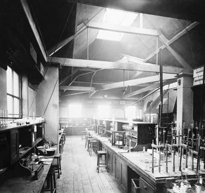 Black and white photograph of a chemist shop window.