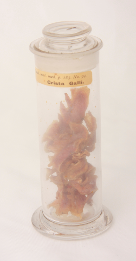 Glass specie jar, with glass lid and paper contents label, containing specimens of cock’s comb (crista galli) from Phasianus gallus. Text on paper contents label reads ‘Catal. mat. med. p. 183. No. 94. Crista Galli.’ From the Burges Collection.