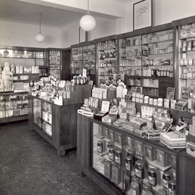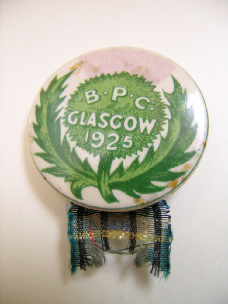 Circular delegate badge from the 1925 British Pharmaceutical Conference in Glasgow. The badge is attached to a piece of tartan ribbon. With thistle design and lettering reading ‘B.P.C Glasgow 1925’