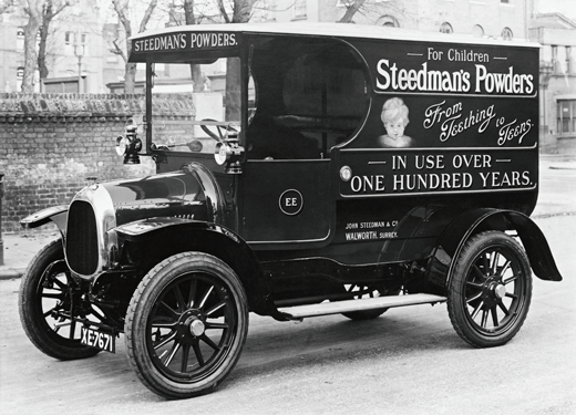 Black and white photograph of a Delivery van in Steedman’s livery. The photograph shows a van with the body work of 1913 adapted to a Beardmore chassis. Steedman’s Powders are advertised on the van.