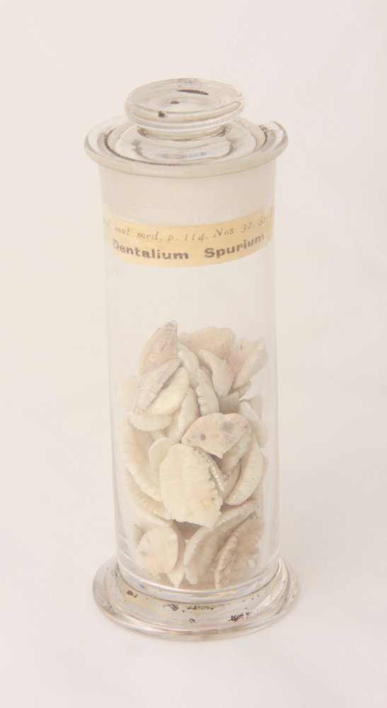 Text on paper contents label reads ‘Catal. mat. med. p. 114. Nos 32. 33. 34. Dentalium Spurium.’