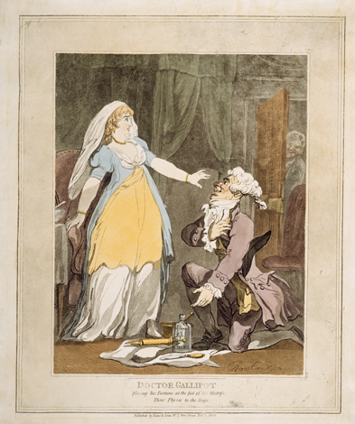 ‘Doctor Gallipot Placing his Fortune at the Feet of his Mistress, Thro’ Physic to the Dogs’ 1808