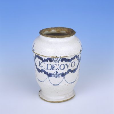 The ‘ribbon cartouche’ design was produced on drug jars from 1655-1670, around the same time as the ‘pipe-smoking man’ design.
