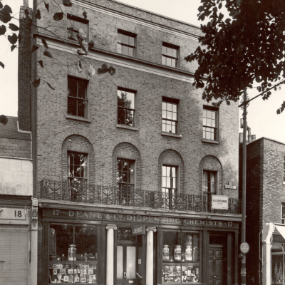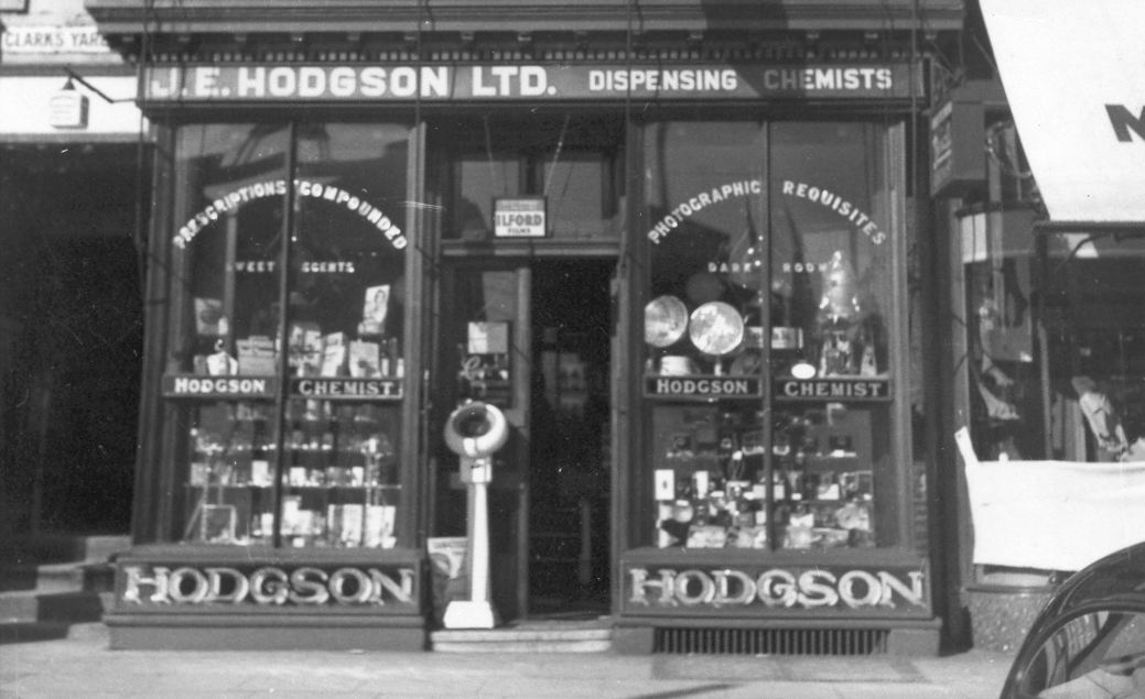 Black and white photograph of the exterior of J.E. Hodgson Ltd, Dispensing Chemists, 14 High Row, Darlington, Lancashire, England. The photograph shows the shop front window and pharmacy signage.