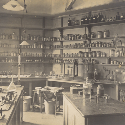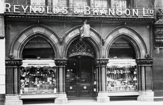 Black and white photograph of the exterior of Reynolds and Branson Ltd., 14 Commercial Street, Leeds, Yorkshire, England. The photographs shows the ground double shopfront of a very elaborate pharmacy with arched windows, marble columns and iron railings.