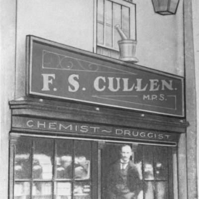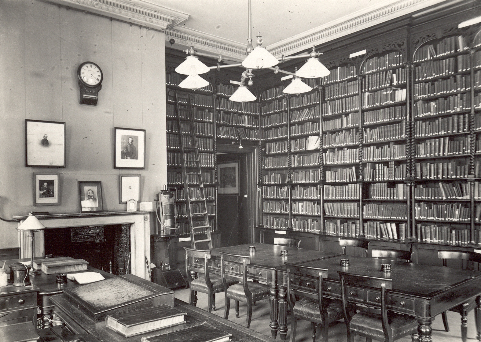 Black and white photograph of the Pharmaceutical Society of Great Britain’s Library at 17 Bloomsbury Square, London. This image shows the front room of the Library after installation of electric light.
