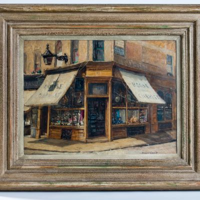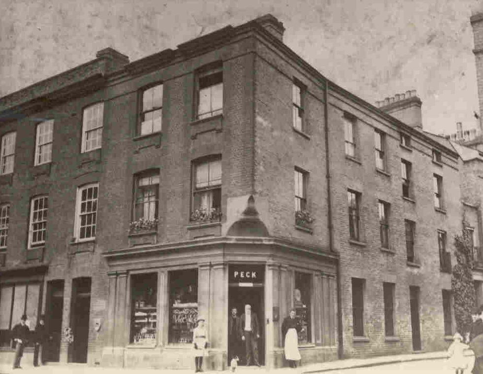 Black and white photograph of exterior of G. Peck, 30 Trumpington Street, Cambridge. Several people can be seen standing at the door, as well as the corner window displays.