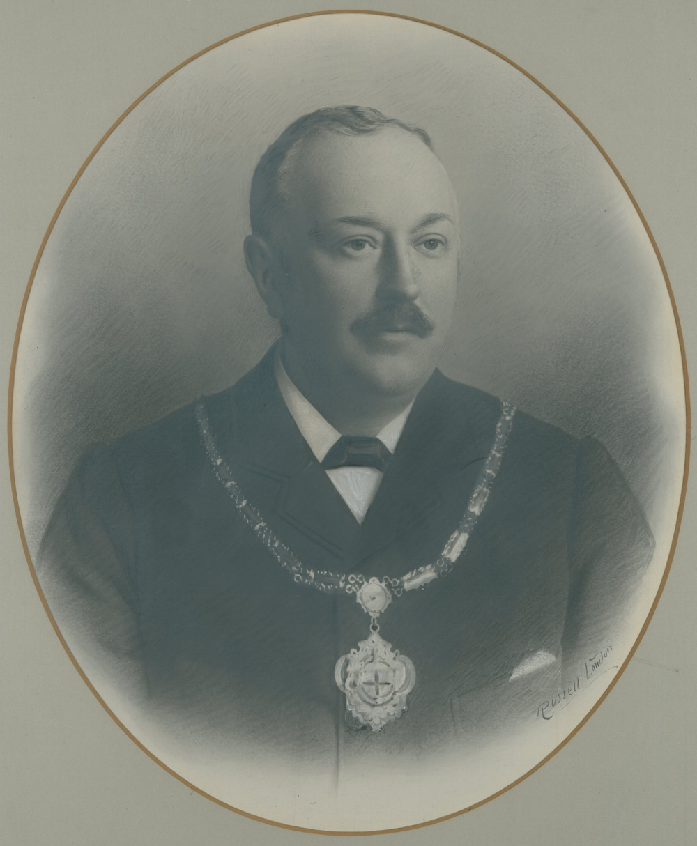 Black and white photographic studio portrait of George Thomas Wilkinson Newsholme wearing chain of office. Photograph taken by Russell, London. Newsholme was President of the Pharmaceutical Society of Great Britain 1900-1903.