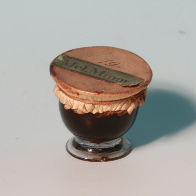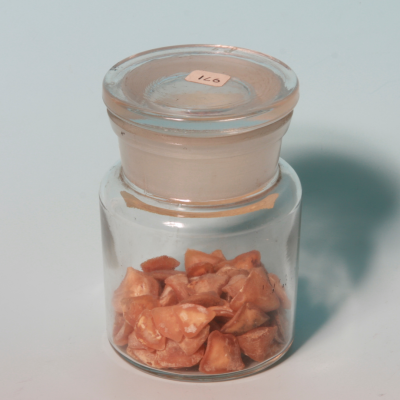 Glass jar, with plastic screw top lid and paper labels, containing specimens of lac, a gummy secretion from the insect Tachardia lacca (Kerria lacca), on twigs. From the Burges Collection.