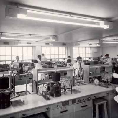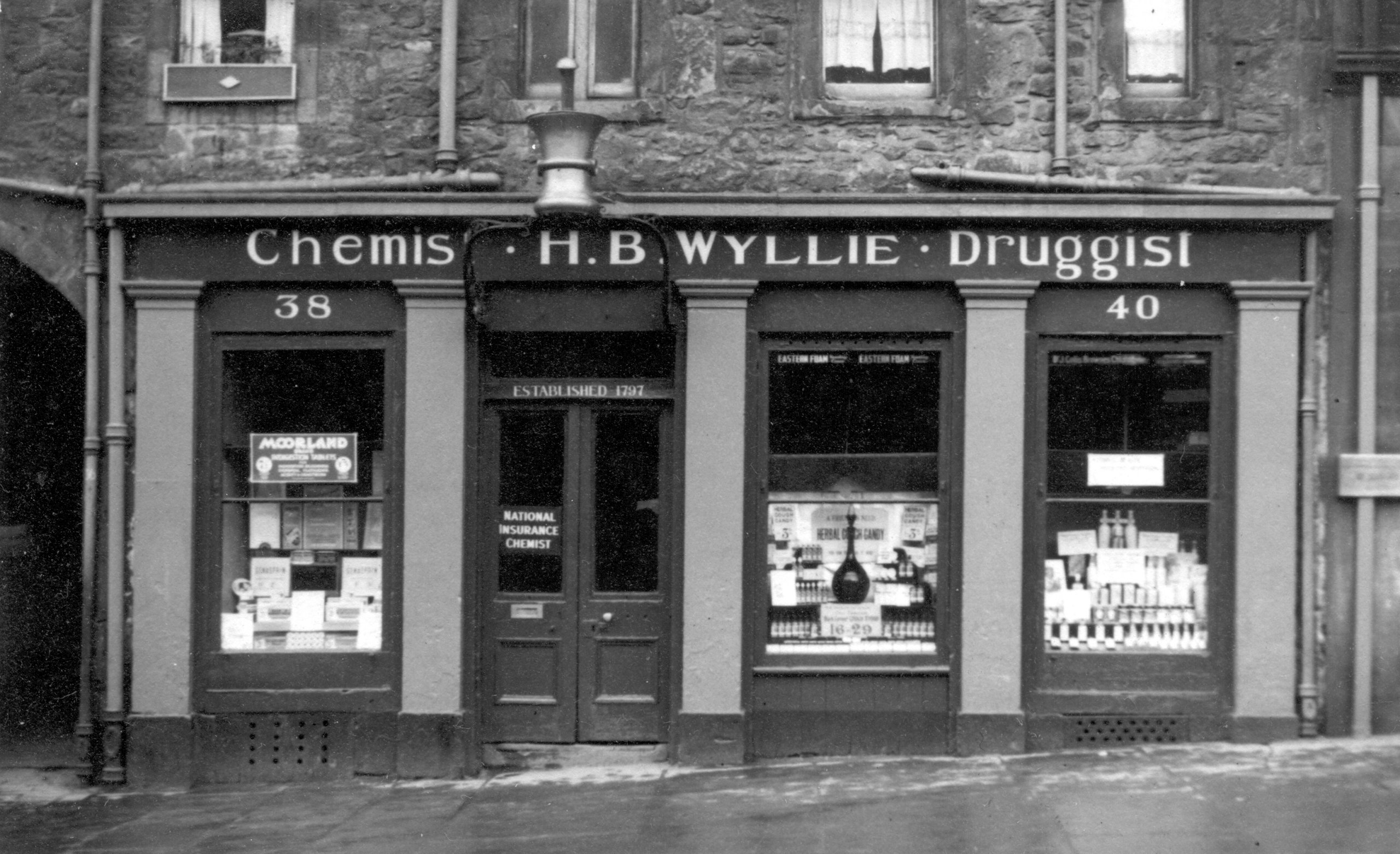 Black and white photograph of H.B. Wyllie, Chemist Druggist, 38-40 Grassmarket, Edinburgh. This photograph shows the exterior of H.B. Wyllie, established in 1797, one of the oldest established pharmacies in Edinburgh. The ground elevation can be seen as well as the pestle and mortar shop sign above the doorway.