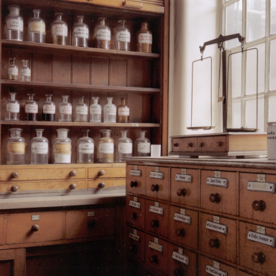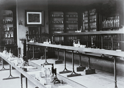Black and white photograph of the Histological Laboratory at the School of Pharmacy, Pharmaceutical Society of Great Britain, 17 Bloomsbury Square, London. This image shows the laboratory when the room was still lit by gas, 1903.