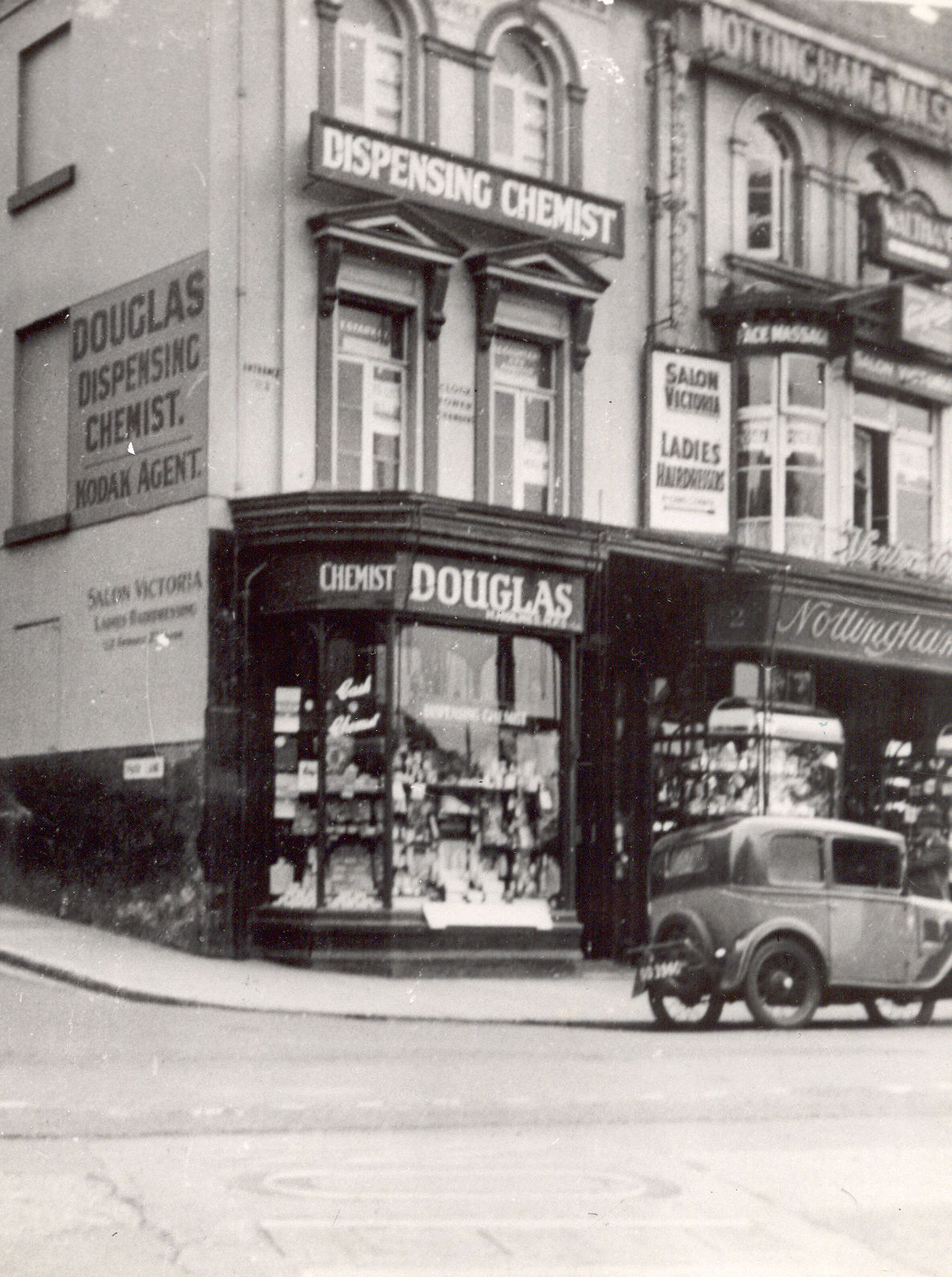 Black and white photograph showing exterior view of the Douglas Chemist, H. Holmes, M.P.S., 1 Victoria Parade, Torquay, Devon, England. The pharmacy was established 1823. The image shows an oblique view taken from across the road showing the building and shop front with signage.