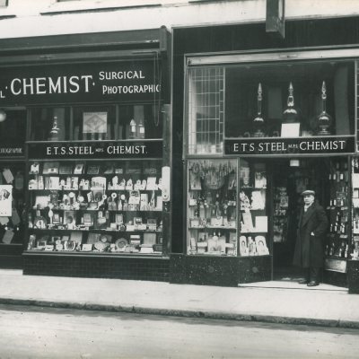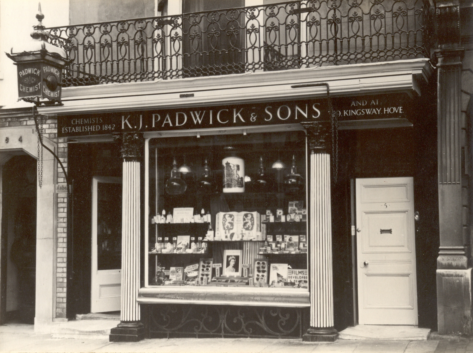 Black and white photograph showing exterior view of K.J. Padwick and Sons, 5 Preston Street, Brighton, Sussex, England. The pharmacy was established in 1842. The photograph shows the front window with display featuring specie jars and carboys.