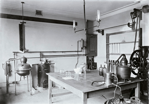 Black and white photograph of Laboratory for applied pharmaceutics, School of Pharmacy, 17 Bloomsbury Square. The photograph shows the laboratory layout with two copper stills, steam heated pan and other equipment.