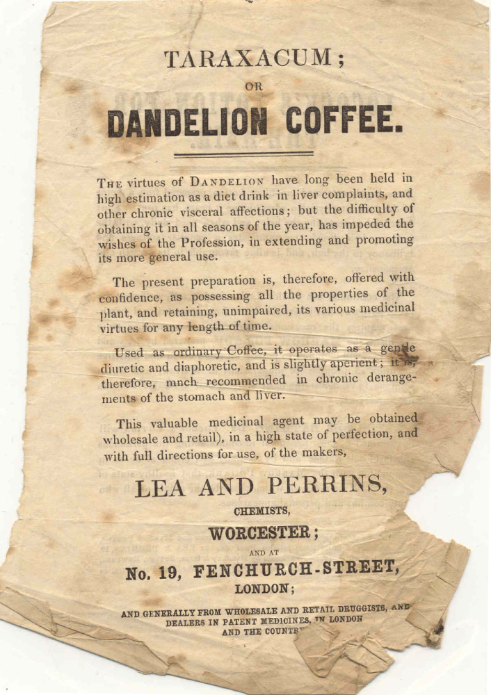 Leaflet advertising taraxacum or dandelion coffee. It claims it is available all year round and helps with ‘liver complaints and other chronic visceral affections.’