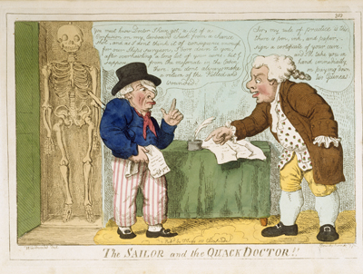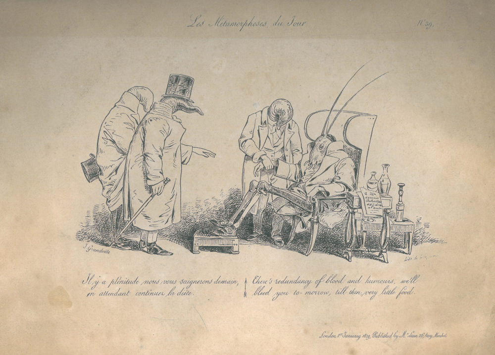In his ‘Les Métamorphoses du Jour’ caricatures, Grandville produced a series of cruel and powerful images that focus on the relationship of the innocent patient, the powerless victim of his medical advisor. These works develop the use of animal form to convey through characterisation particular aspects of human folly, weakness and corruption.