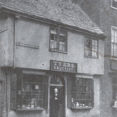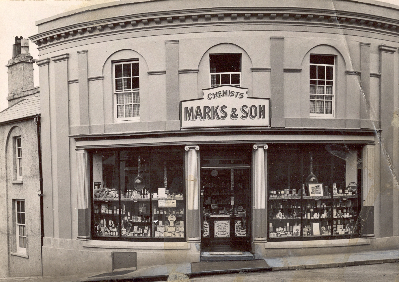 Black and white photograph showing exterior view of Marks and Son, Chemists, 36 Hill Road, Clevedon, Somerset, England. The photograph shows a view of the building frontage with window display.