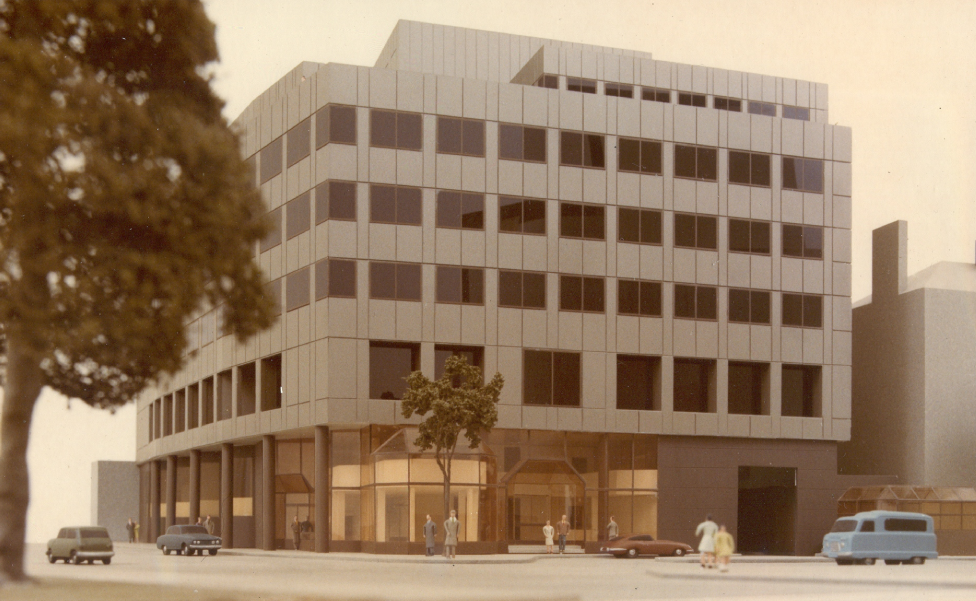 Colour photographic print. Photograph of the architect’s model of the proposed six storey design for the Pharmaceutical Society of Great Britain’s new headquarters at 1 Lambeth High Street, 1971. View as if from Lambeth Road of the six storey building and entrances.