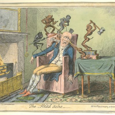 This caricature depicts the scene of a shipwreck. All of the characters appear to be drowning except for a sailor in land rig, with a long pigtail and tar hat who sits jauntily astride a large crate full of Morrison’s pillboxes which is marked “MORRISON’S PILLS For SEA SERVICE”.