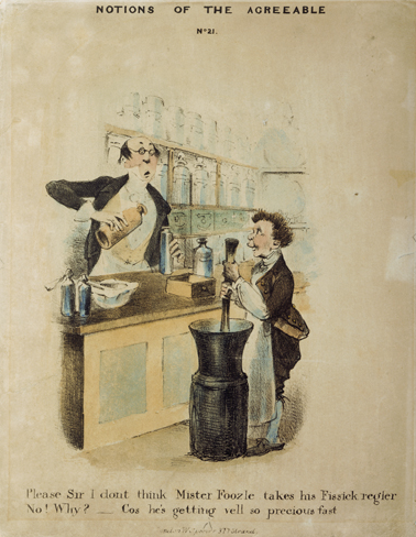 Lettering below the design reads: “Please Sir I don’t think Mister Foozle takes his Fissick regler” / “No ! Why ? __” / “Cos he’s getting vell so precious fast”. On the counter are bottles, a drawer from the drug run, shop rounds and a marble mortar.