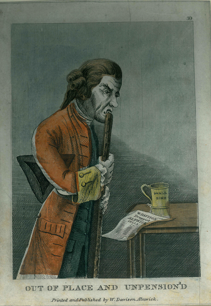 This caricature features a three-quarter length portrait of a preoccupied man, in an old-fashioned frock coat, his hair tied in a queue, with a cocked hat under his right arm, facing to the right he leans thoughtfully on a long staff. Before him is a table bearing a flysheet headed; “W. DAVISON Druggist ALNWICK SELLS”, and a mug lettered; “SMALL BEER”.
