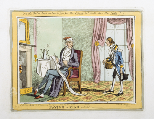 A footboy, in livery, hat in hand, basket on arm, has brought a doctor’s bill to a convalescent gentleman. The gentleman sits in an armchair in a drawing room, wearing a patterned nightgown and a cap. He studies closely through his spectacles, with some surprise, the very long paper bill, saying “Tell the doctor I will certainly pay for the Physic but shall return the Visits!”