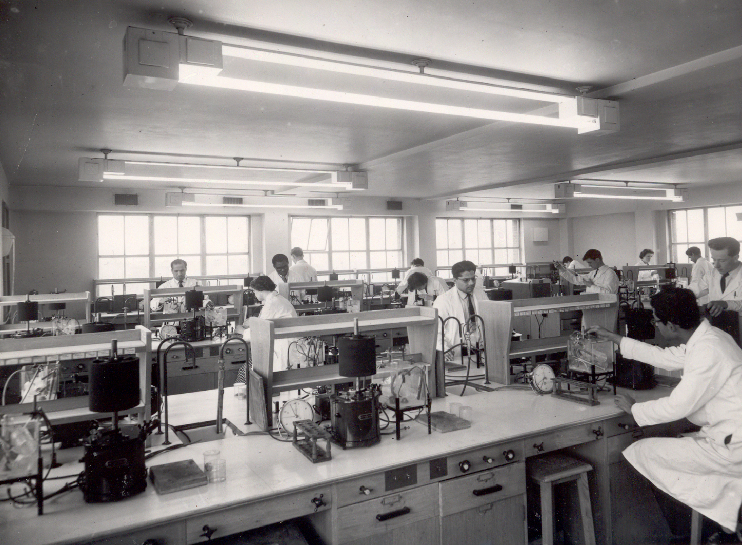 Black and white photograph of a Pharmacology teaching laboratory at the School of Pharmacy, University of London at Brunswick Square, London.